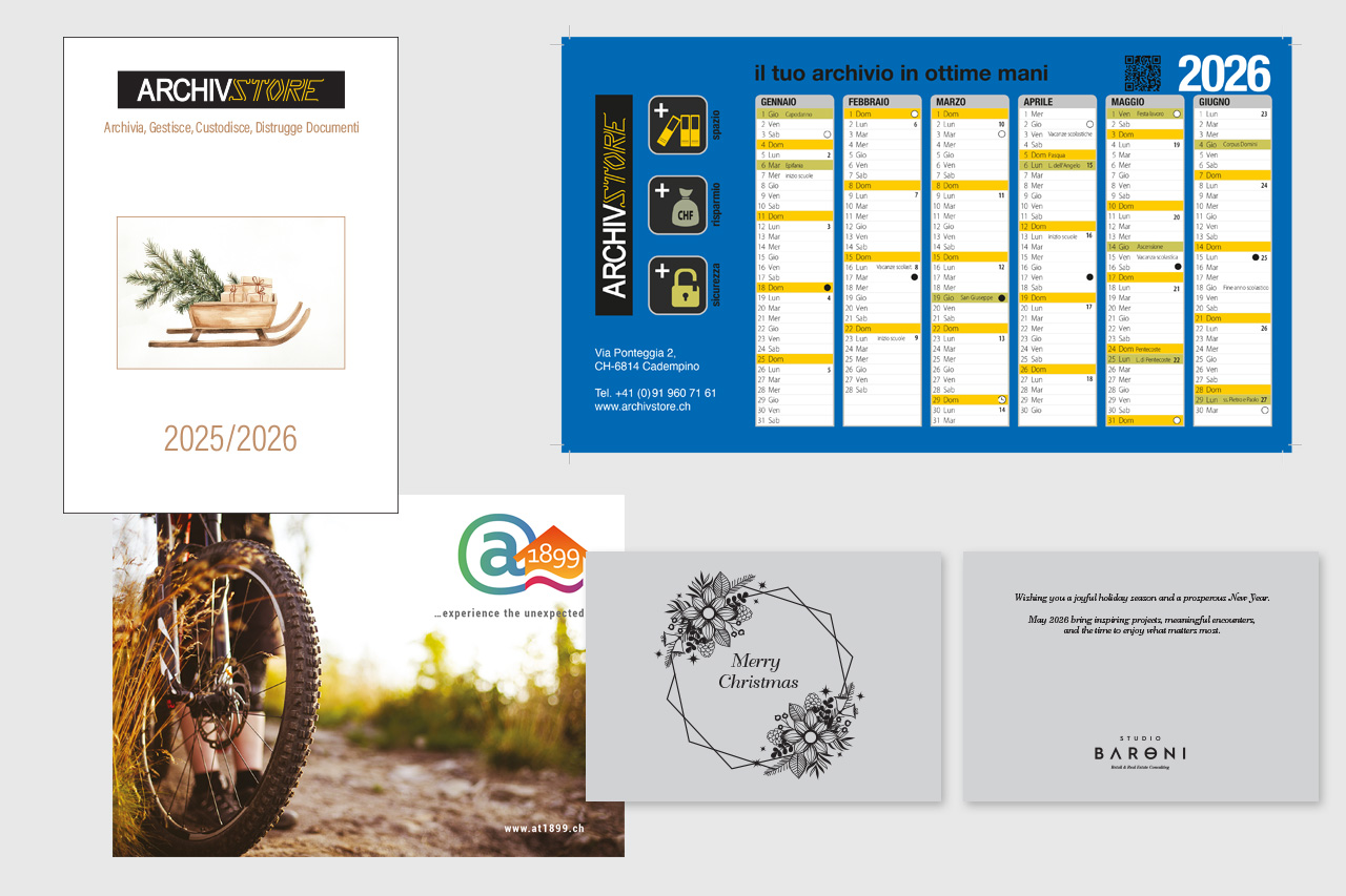 Creiamo e realizziamo ogni sorta di prodotto grafico. Dal volantino pubblicitario A5 al grande manifesto stradale, dalla piccola brochure aziendale al pregiato libro di molte pagine. Dal biglietto da visita all'immagine coordinata completa.